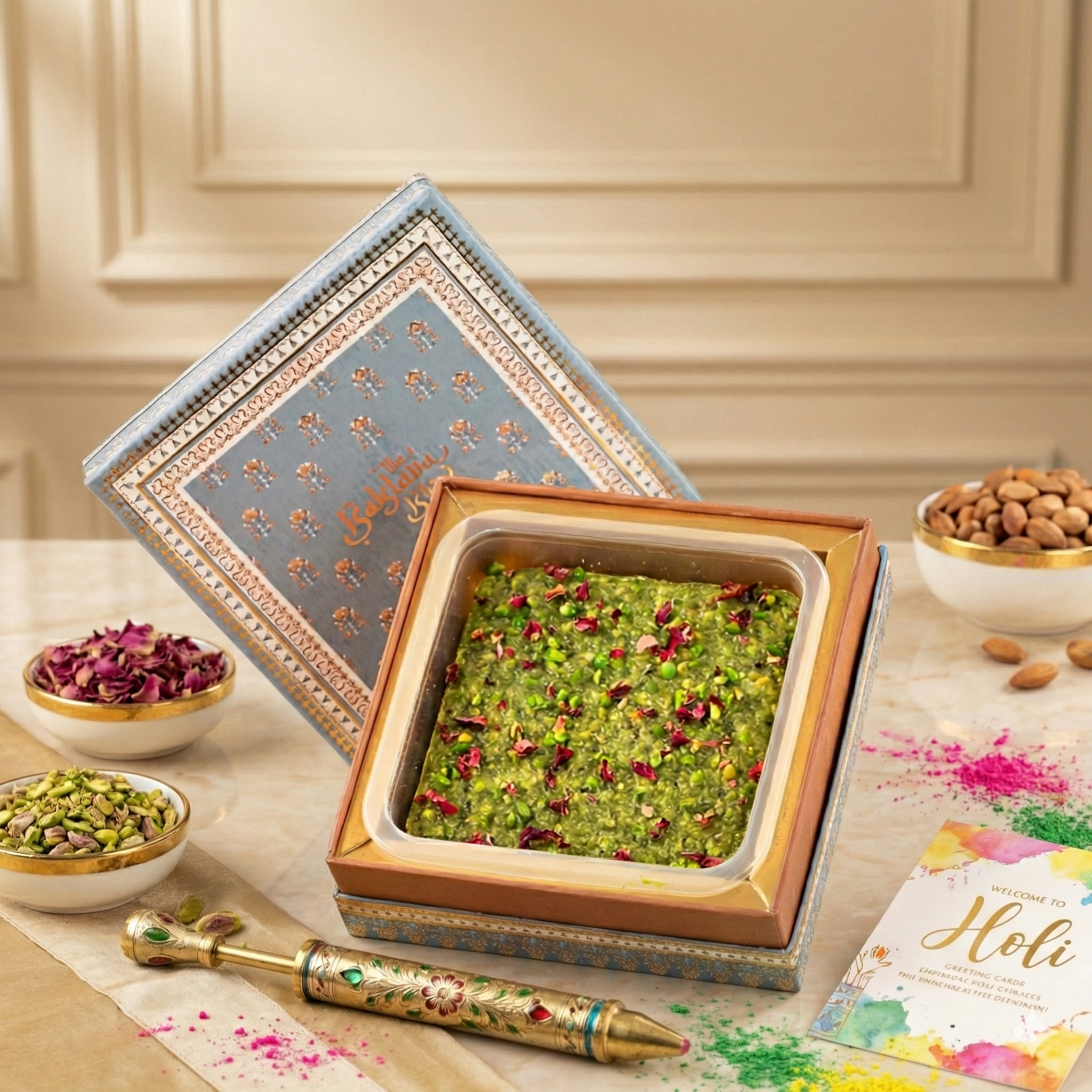 Celebrate the spirit of Holi with a hamper that blends timeless tradition and refined indulgence. Our Holi Baklava & Dryfruit Box features handcrafted baklava layered with rich pistachios, premium walnuts, and golden honeyed sweetness, paired with an assortment of carefully selected dry fruits for a wholesome festive touch.